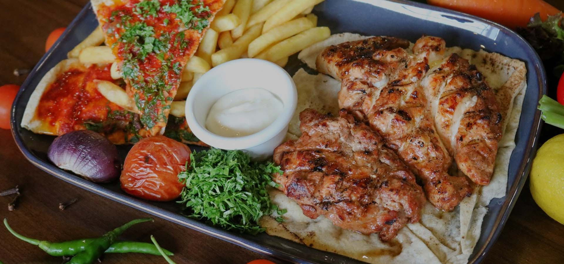 Grilled beef served with Gravy garnished with grilled tomatoes